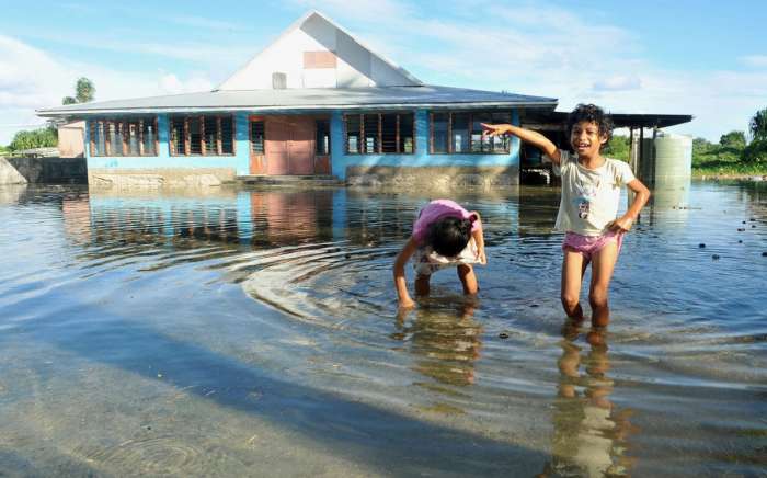 Sea level in Kiribati is fastly raising due to climate change to the extent that some houses are already surrounded by water.