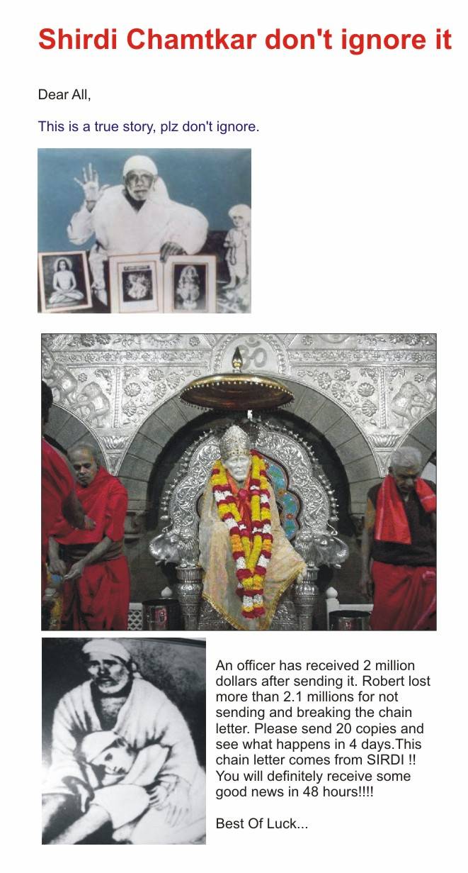 “This message comes from Shirdi. Saibaba is going to do a miracle in your life if you forward this to 9 of your friends”