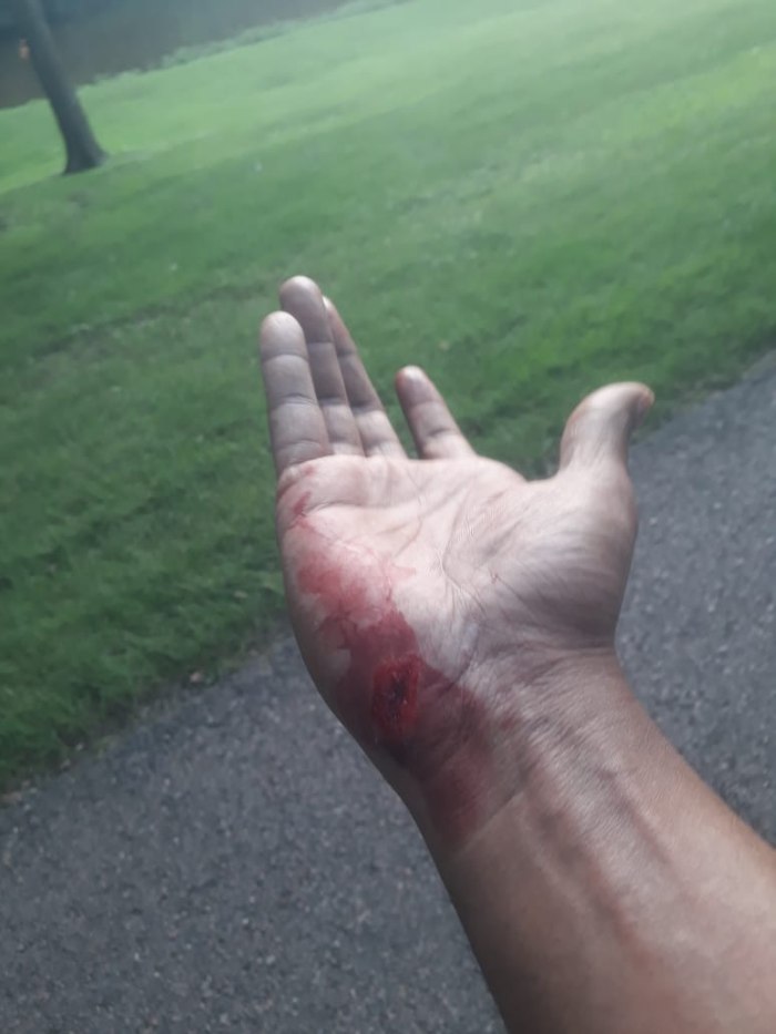 (The featured photo shows the deep wound in my palm. Though it was painful, I wanted to cover the green lawn and the top corner shows the river. You can’t take the photographer in me even in such situation..he he )